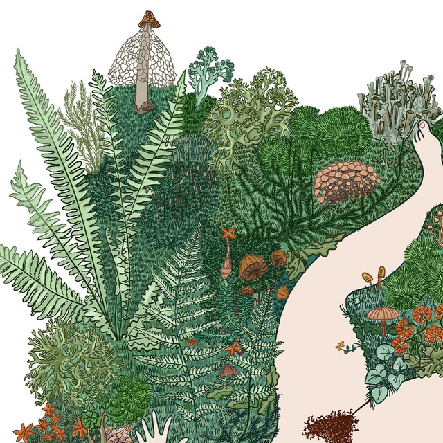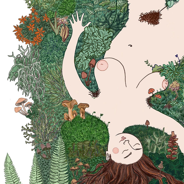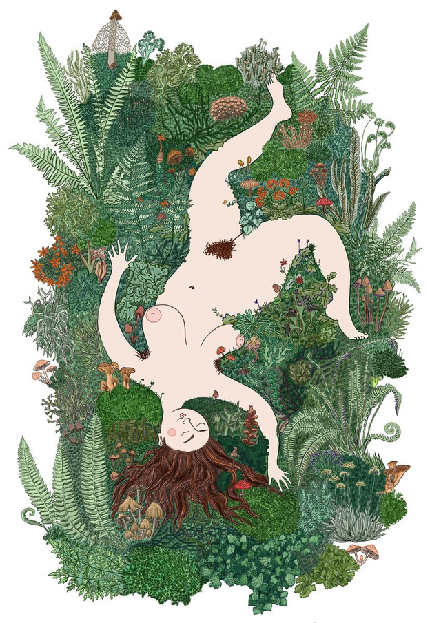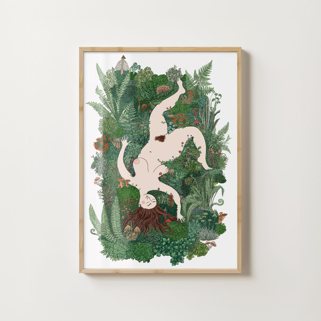 I tried it first in person and it was a truly transformative experience. Later, I decided to illustrate that feeling. Most of the moss, mushrooms and plants are based on old botanical drawings I found online, hence: true to the bizarre and surreal shapes only nature can come up with. I hope having this print will remind you of that connection to nature and help celebrate womanhood.